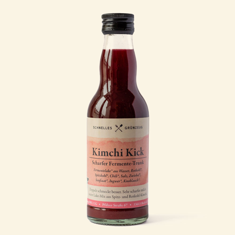 Achtung: Gefährlich geschmacksintensiv! Dieser scharfe Fermente-Trunk ist die Essenz aus zweierlei Lake: Rot- und Spitzkohl-Kimchi. Sobald diese Geschmacksbombe auf der Zunge landet, breitet sie sich aus wie ein Lauffeuer – Umami sei Dank läuft das Wasser im Mund zusammen, löscht das Ganze und hinterlässt eine angenehme Spur von Raucharomen.